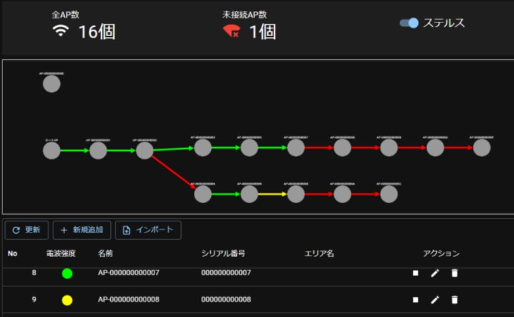 通信不安定なSSの近くに、補助アンテナを仮置きして、通信状態を目視確認、良好な位置に本設置して、ネットワークを構築できます。