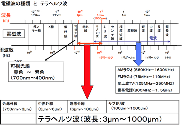 テラヘルツ波の存在は、古くから認知されていましたが、人工的にテラヘルツ波を発生したり、検出することが困難であったため、未開拓電磁波領域とも呼ばれてきました。