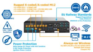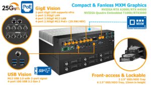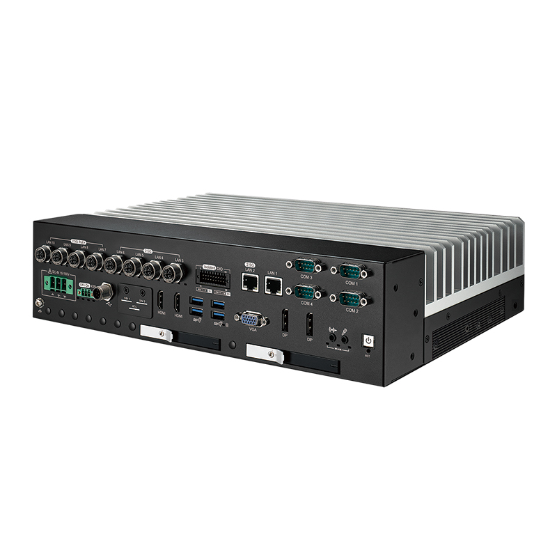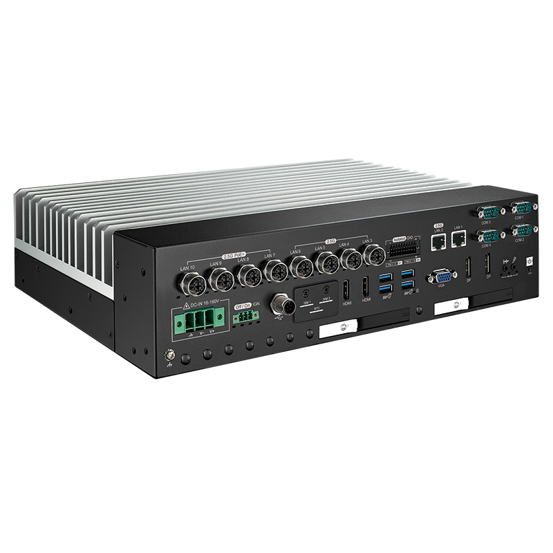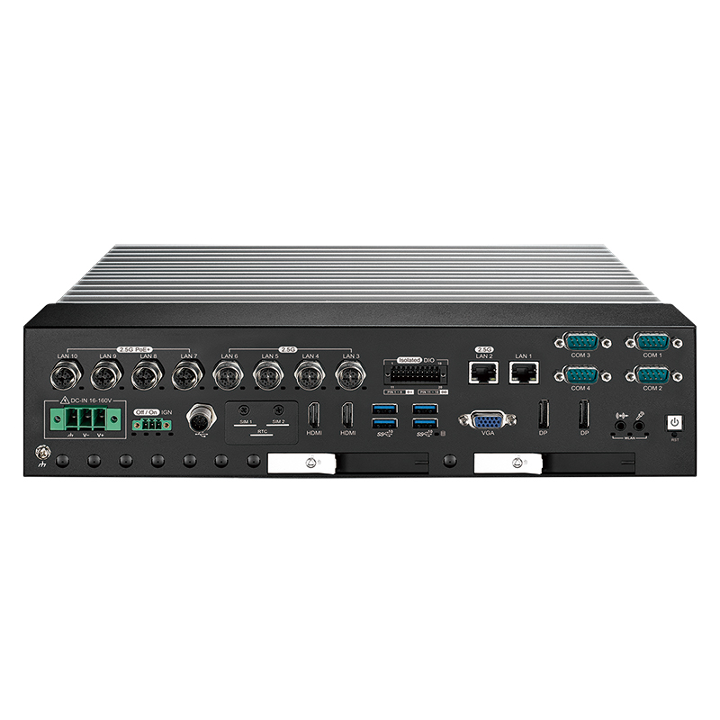 ・独立で動作する2.5G LANポート8基装備、うち4基M12 Xコードコネクタ仕様でIEEE 802.3at PoE+対応、2.5GigEとGigE LAN各1口装備、4基絶縁型COMポート装備