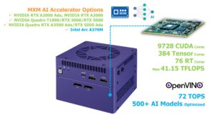 ・Compact MXM Accelerator : NVIDIA RTX A2000 Ada, NVIDIA RTX A2000, NVIDIA Quadro T1000, NVIDIA Quadro RTX 3000, NVIDIA Quadro RTX 5000, NVIDIA Quadro RTX A3500 Ada, NVIDIA Quadro RTX 5000 Ada, Intel Arc A370M