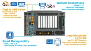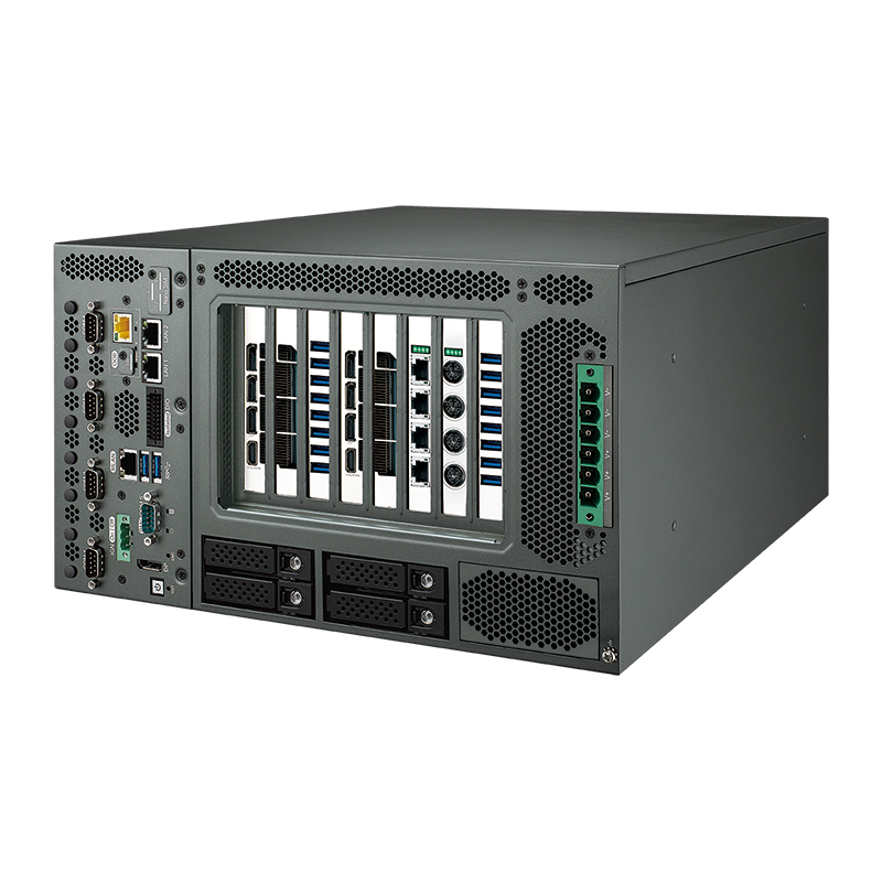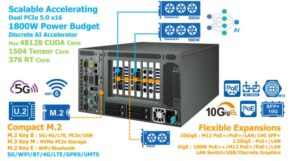 複数のPCIe拡張ポートにより、10GigE M12 PoE+ LAN、10GigE PoE+ LAN、10GigE LAN、10G SFP+、2.5GigE PoE+ LAN、2.5GigE LAN、100W PoE++、M12 PoE+ LAN、PoE+ LAN、GigE LAN、LANスイッチ、USB、ディスクリートグラフィックス、またはAIアクセラレータを複数接続可能